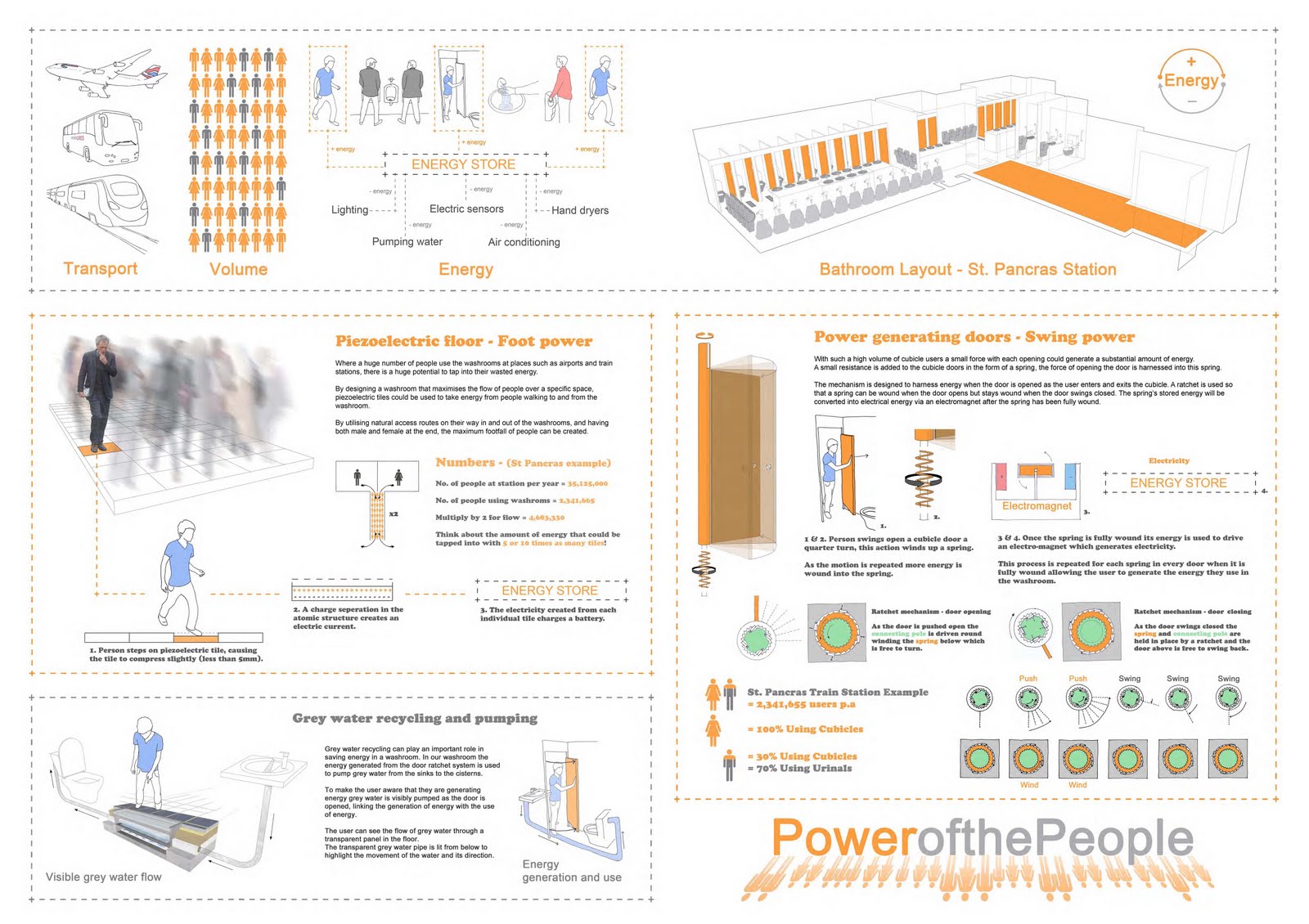 Our entry is about harnessing energy generated by people in washrooms. We focussed on washrooms with a high throughput and lots of cubicles. The key concept is an energy generating door hinge, which potentially has global appeal as it could be utilised within all sorts of buildings! There are other ideas for power of the people here too.