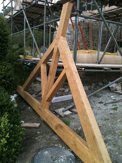 This is the new oak truss waiting to be installed in the roof. The joints are pegged for a traditional approach to the design.