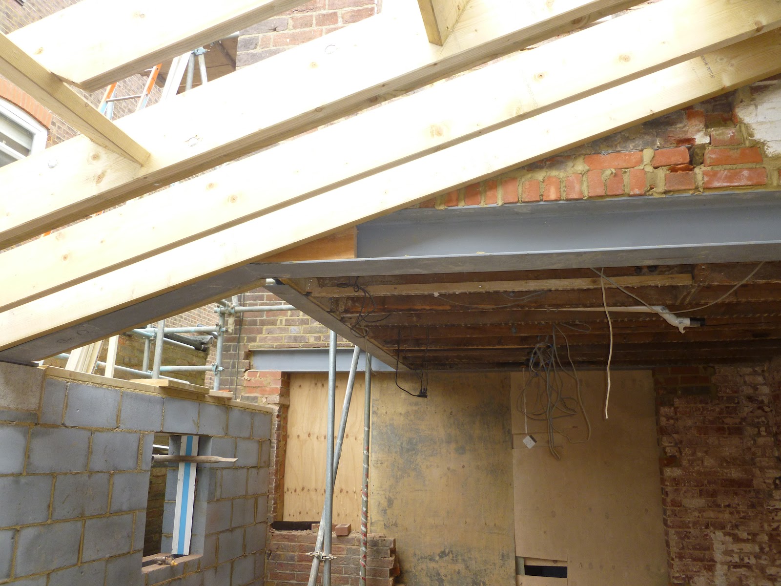 Large new room with 4 rooflights is being created by the clever insertion of bespoke steelwork. Drainage is threaded into the available space. New brick arch is formed to match existing. The floor level has been lowered to achieve the maximum size of room at the rear of the property. There were some amendments needed to water and gas services to allow these works to happen. Inside the staircases are new, in order to add a new ground level wc and to allow access to the new loft room.
