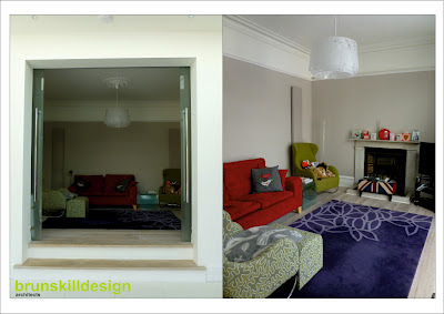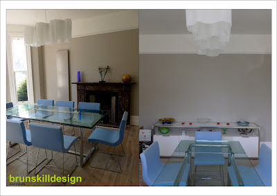 Formal Dining Room with Artemide Light Fitting and Italain Radiators with no pipes showing.  Limed Oak flooring and Elephant’s Breath Farrow and Ball matt paint.
